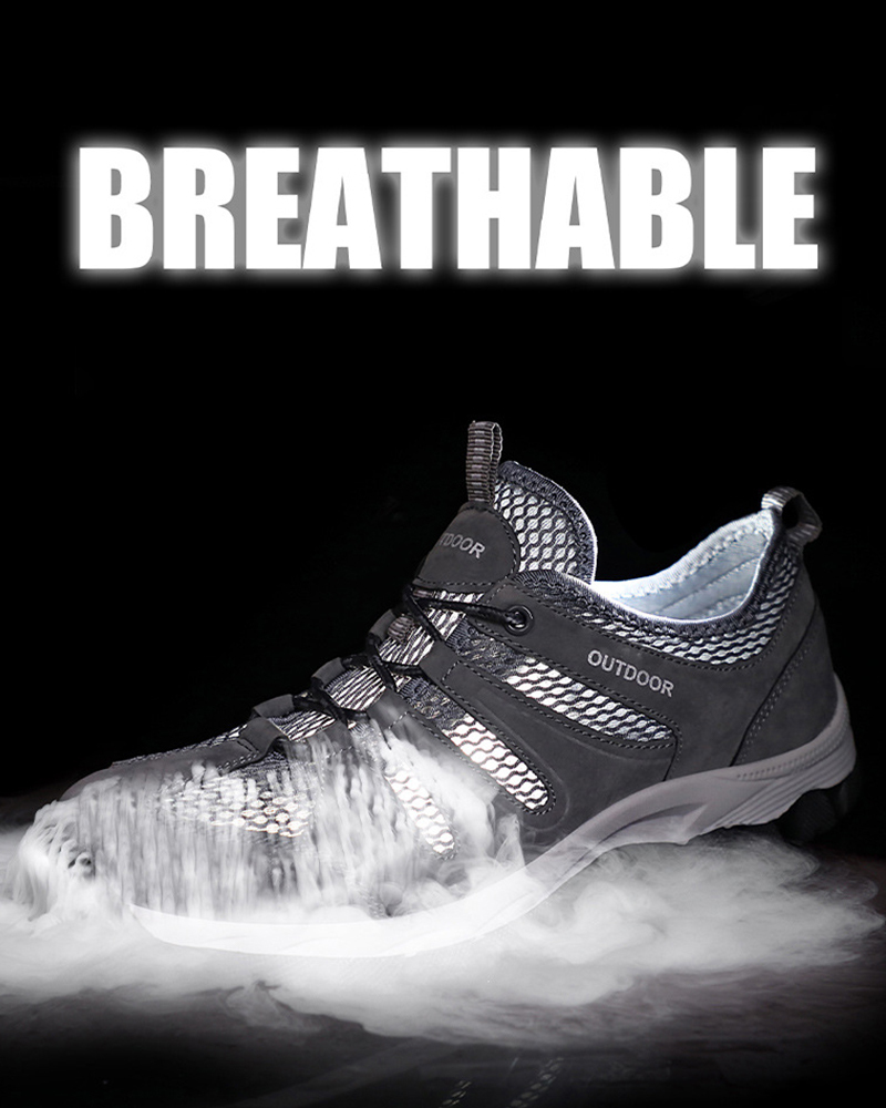 A men's outdoor shoe designed to provide breathability and comfort for activities such as hiking and climbing. The shoe appears to have a mesh surface, a breathable material that allows air to circulate to keep feet cool and dry. The hollow design can also help ventilation and breathability.