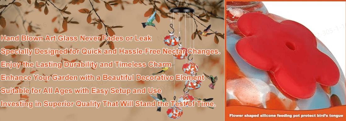 - 【Innovative Wind Chimes Feeder】 A creative blend of windchimes and humming birds feeders for outside, providing multiple feeding spots. A versatile addition to any indoor or outdoor space.