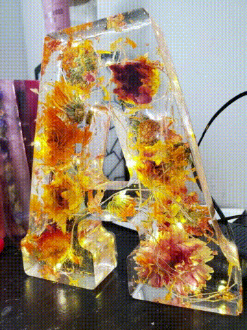 Embedded within the Resin are delicate dried flowers, preserving their natural beauty and creating a mesmerizing visual effect when illuminated. Each flower is carefully selected for its color, shape, and texture.