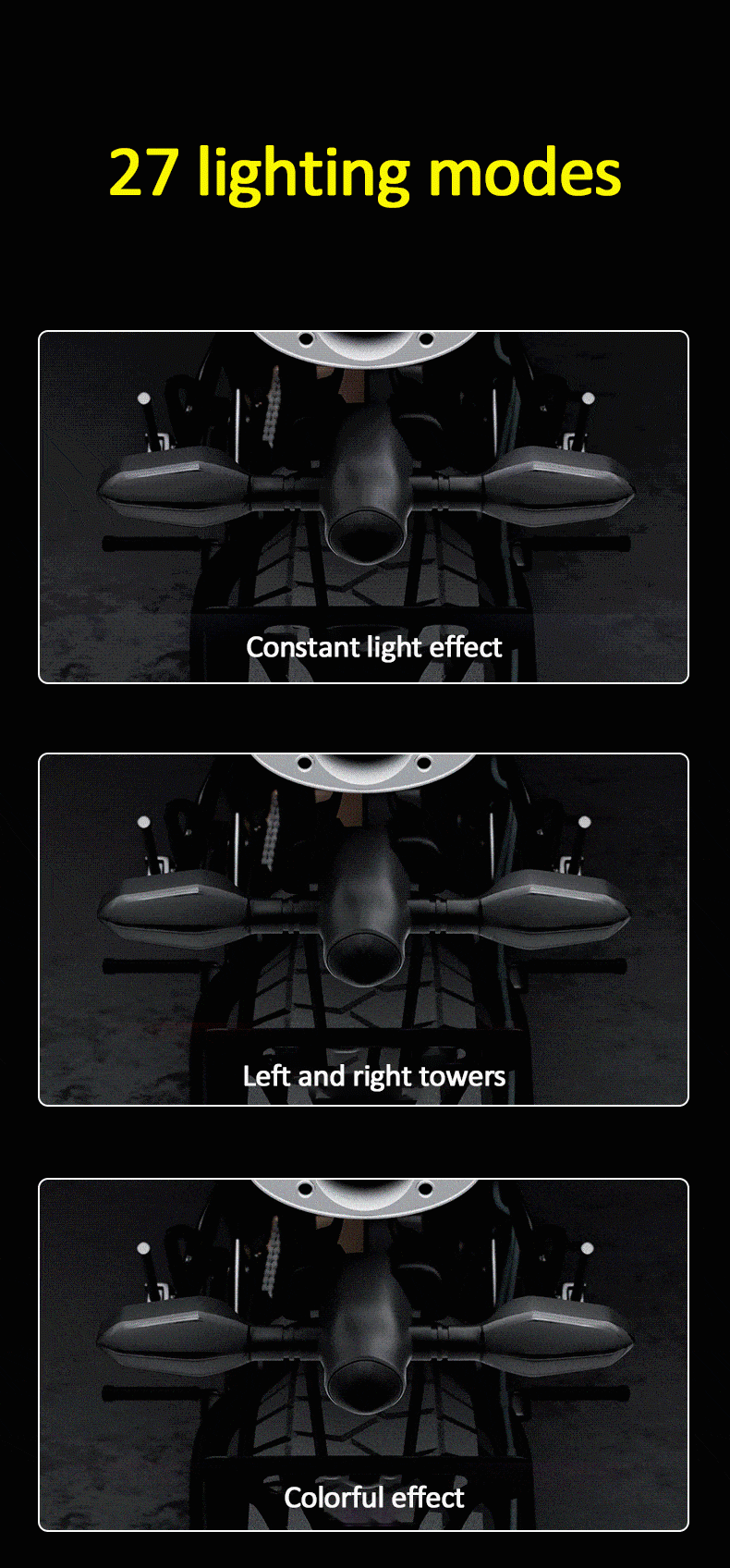 - 27 Dynamic RGB Lighting Modes for Daytime Running Lights – Includes customizable ambient lighting effects, such as flowing, gradient, and solid color modes, giving your ride a unique and eye-catching look. Note: If your motorcycle or electric bicycle is not equipped with daytime running light wiring, the RGB ambient lighting modes will not be functional
