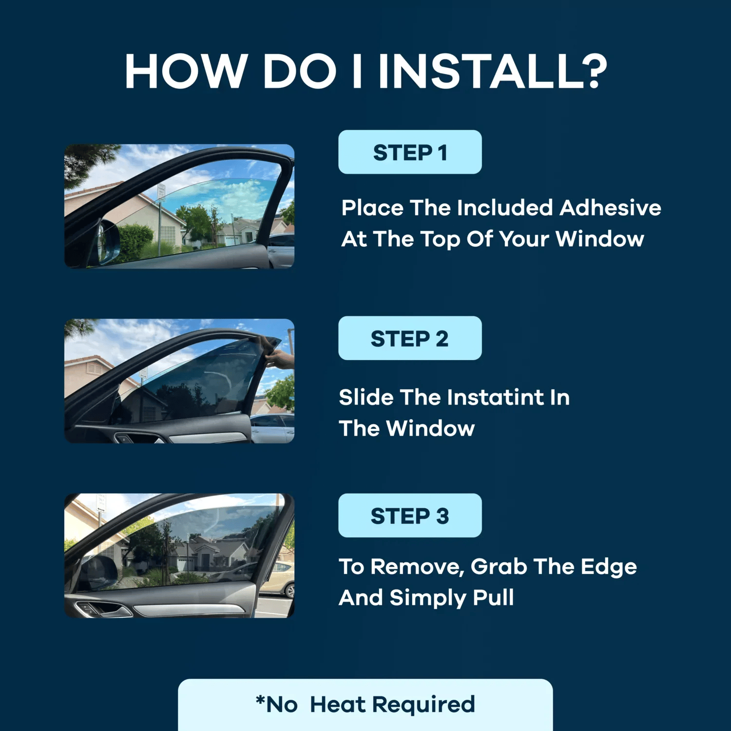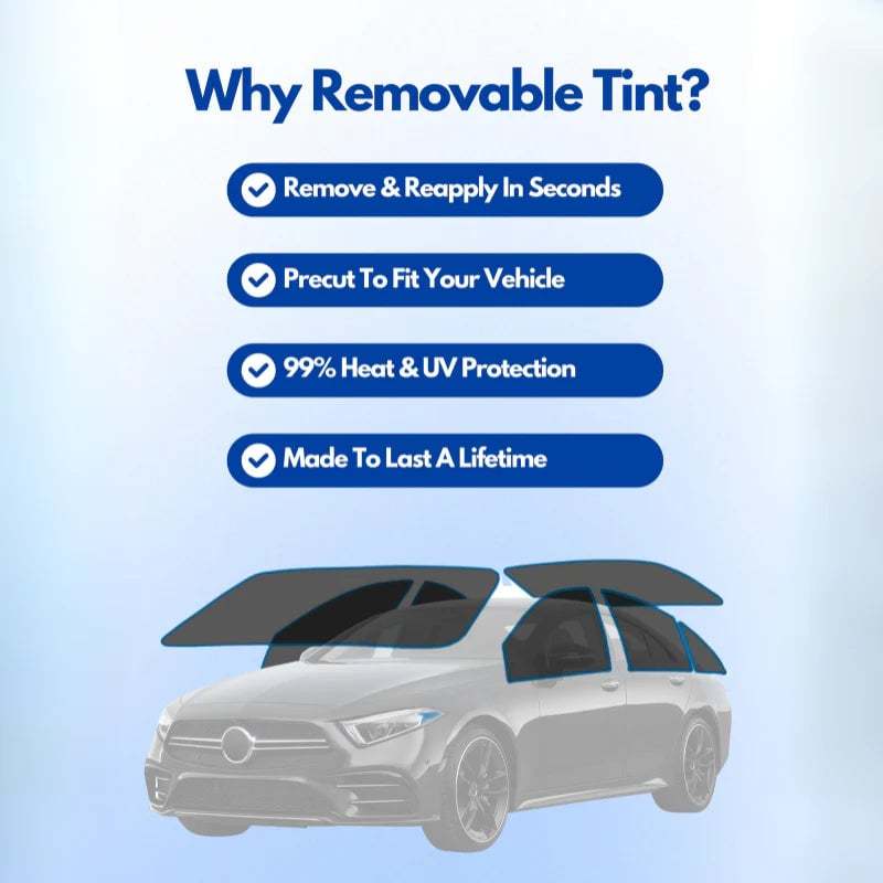 Our removable window tint is made for any car and is pre-cut to fit your windows! Our tint offers 99% heat andUV protection, to keep yourcar cooler while protectingyour privacy! Each order is made with durability and visibility asa top priority. We include a simpleinstruction manual that willallow you to install your tintin seconds! Removal is just asquick, simply give it a pull!!