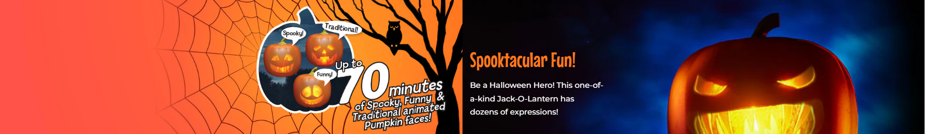Bring your Halloween to life with Jabberin' Jack—a talking, joking, and singing animated pumpkin! Featuring a shimmering 8-inch HD face, a built-in projector, and powerful speakers, it's the ultimate centerpiece for any spooky scene. Simply plug it in and watch it entertain guests, amuse the kids, and steal the show.