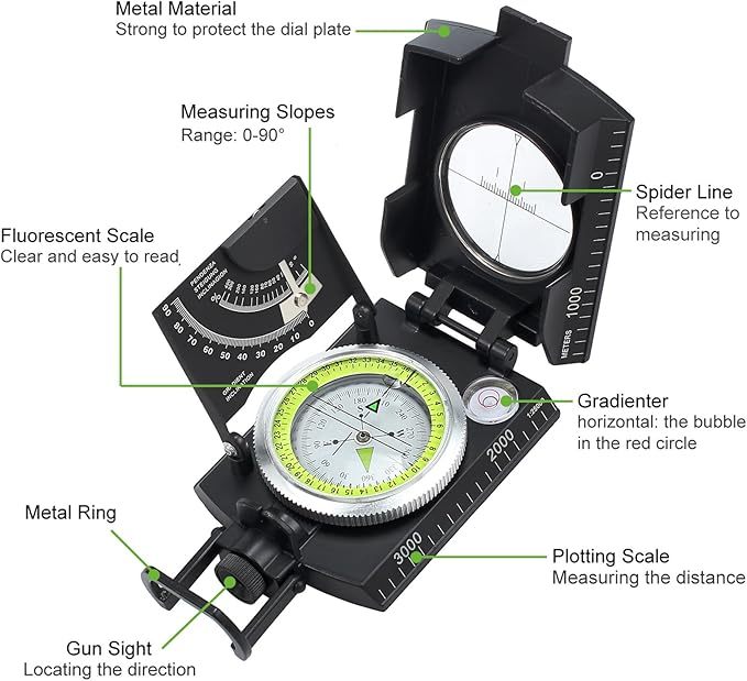 With a line of sight as precise as a magic arrow, you can easily lock onto a target thousands of miles away, as if you have the superpower of seeing into the future! The adjustable diopter sight allows you to see everything clearly regardless of myopia, hyperopia or astigmatism. The rotating frame ring and measurement conversion table make operation as easy as breathing. In addition, we have also thoughtfully prepared a sturdy and durable canvas bag for you, like an indestructible armor to protect your precious compass. At the same time, it is equipped with a lanyard for easy hanging, so you can use it anytime, anywhere. What's even more amazing is that it can be stably mounted on a tripod to meet your ultimate needs in any complex scene!