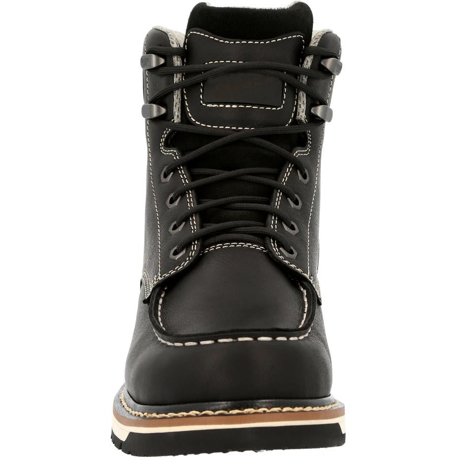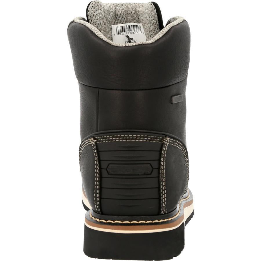 The interior of this black 6" wedge work boot is equipped with our guaranteed waterproofing system and lined with a soft performance mesh. The 3-D molded counter pocket provides additional heel support and comfort. The removable memory foam insole is a layer of cushioning polyurethane topped with a layer of memory foam for all day extreme comfort.