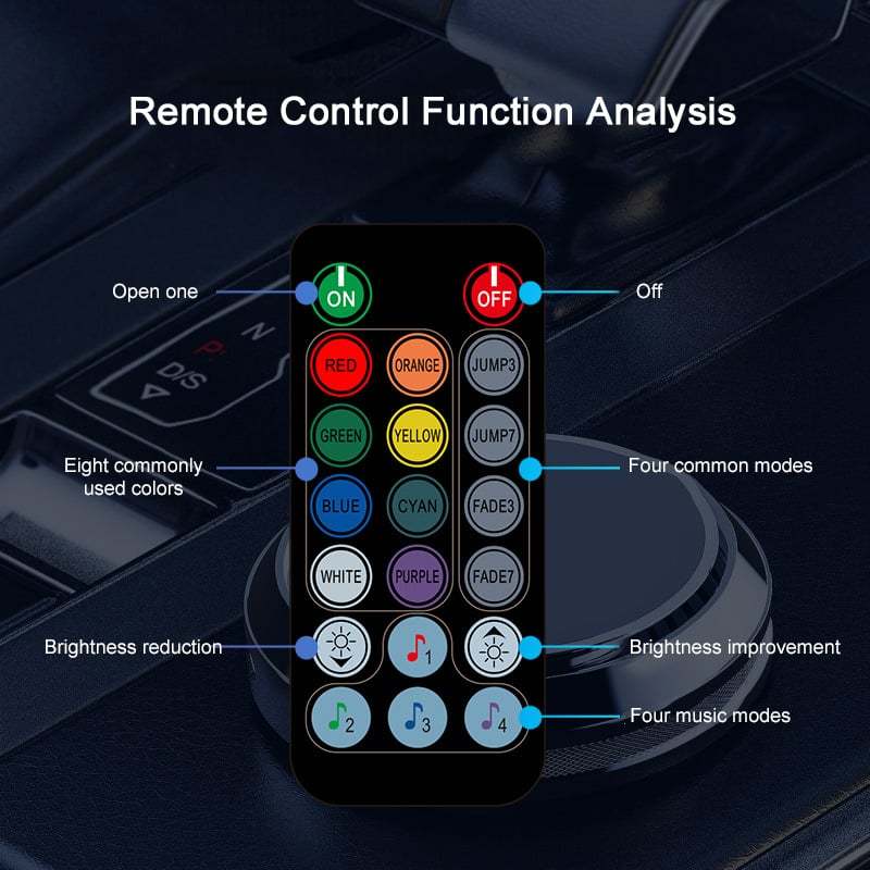 🚘【Color】7 static monochrome, 7 dynamic switching, adjustable brightness and speed.