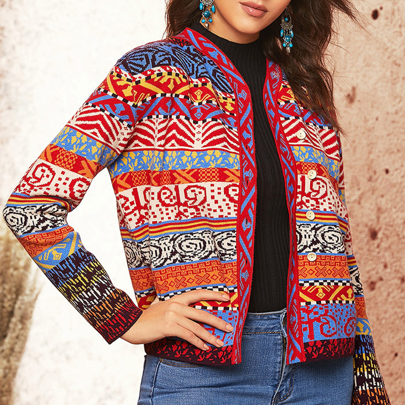 Ethnic Print Long Sleeve Casual Knit Cardigan