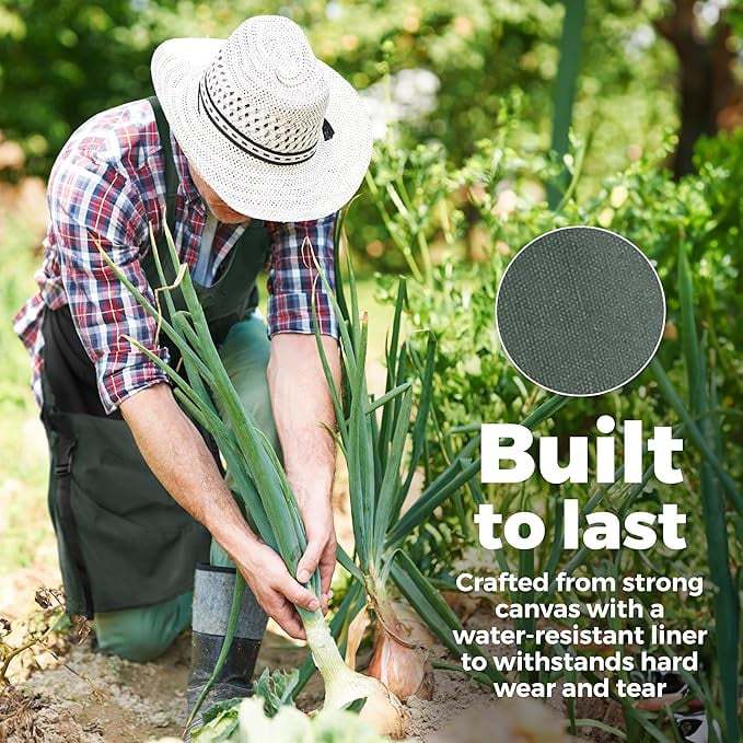 Heavy Duty Oxford Canvas - Crafted with durable, water-resistant, chemical-proof Oxford Canvas, this apron is designed to withstand heavy use. It shields your clothes from stains caused by sludge and moisture from weeds, vegetables, and fruits. The apron features double stitched utility pockets, as well as thick top and bottom hems for added strength and structure. Despite its robust construction, it remains lightweight and comfortable, ensuring long-lasting durability and resilience.