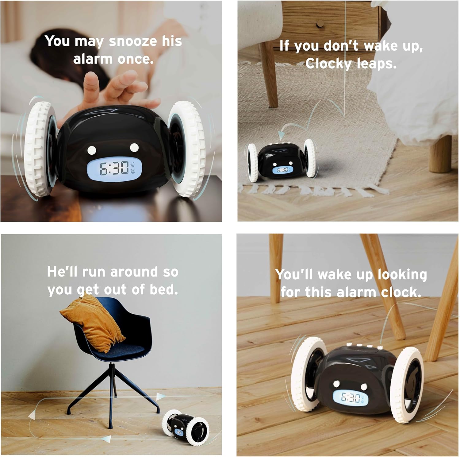 ✅Runaway Clock On Wheels:Clocky is a super loud digital alarm clock that jumps and rolls away in your bedroom, making it the perfect heavy sleepers alarm clock. This jumping alarm clock features a very loud alarm.