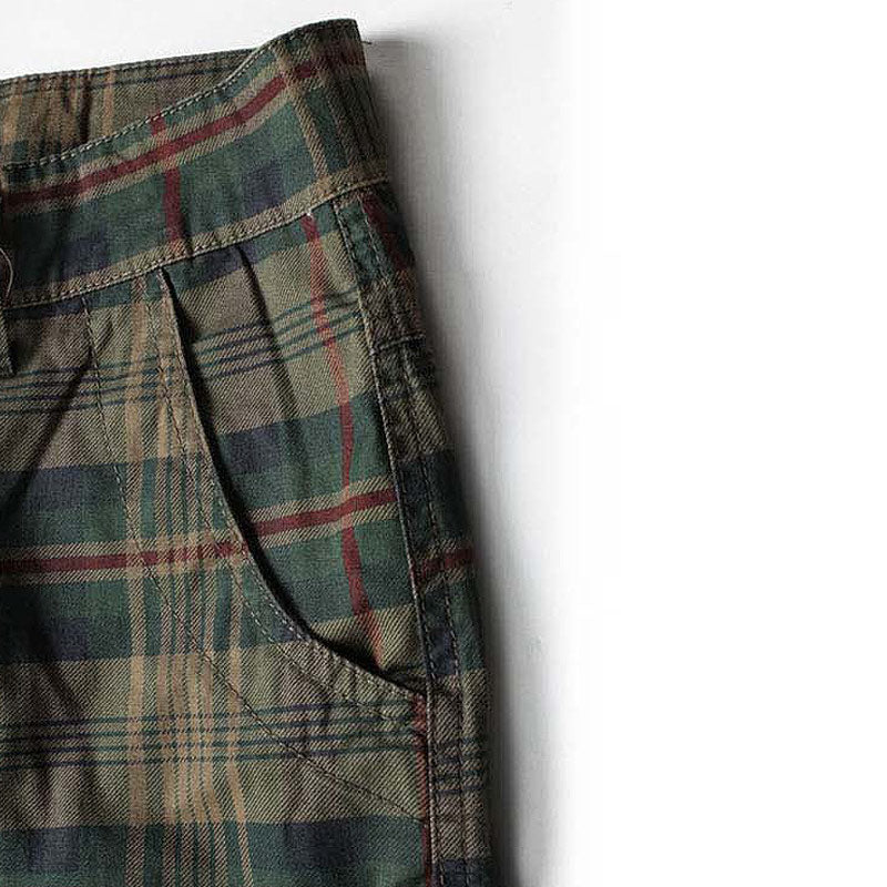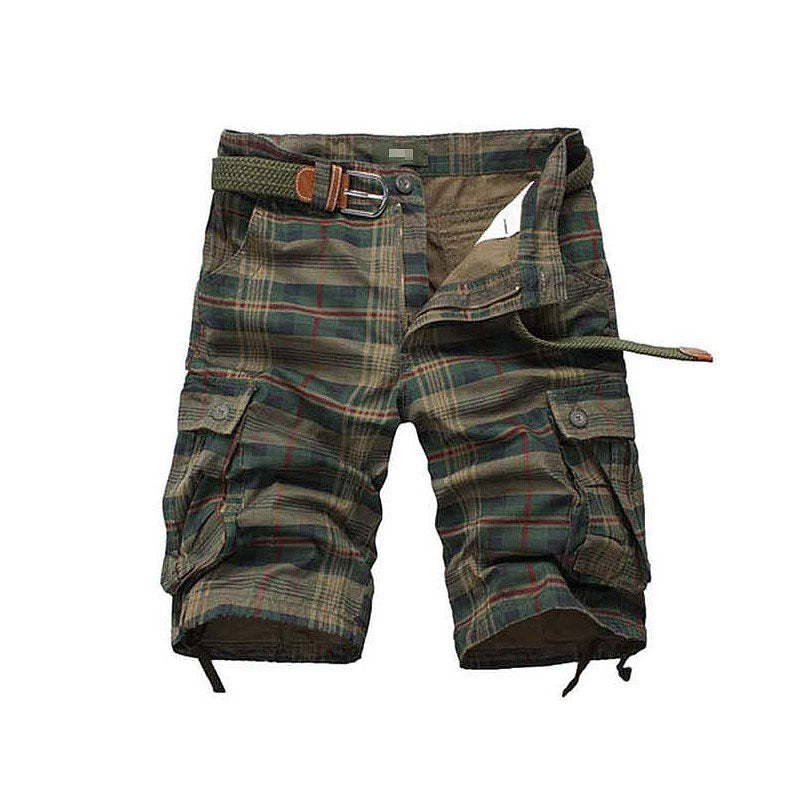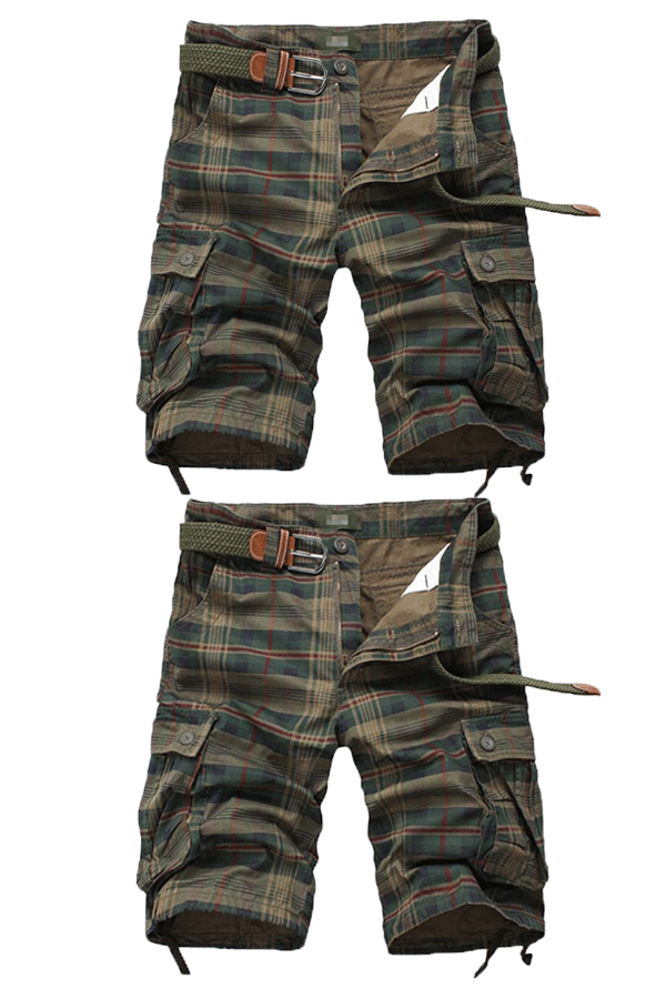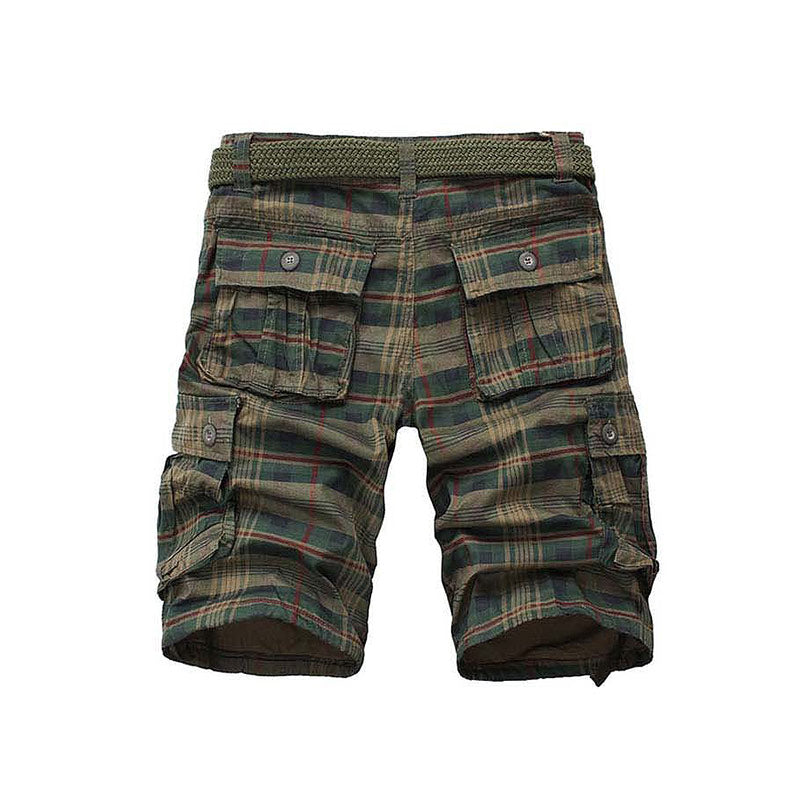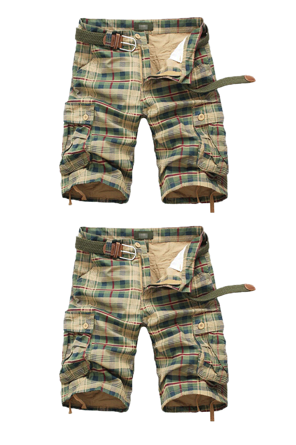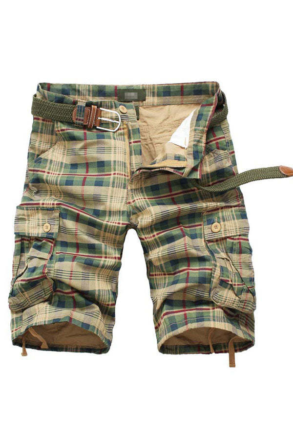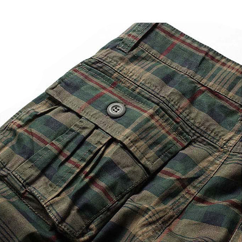 Durable cotton-poly cargo shorts designed with a plaid pattern and furnished with drawstrings in the hems to adjust the fit. Ample pockets are buttoned to secure essentials.