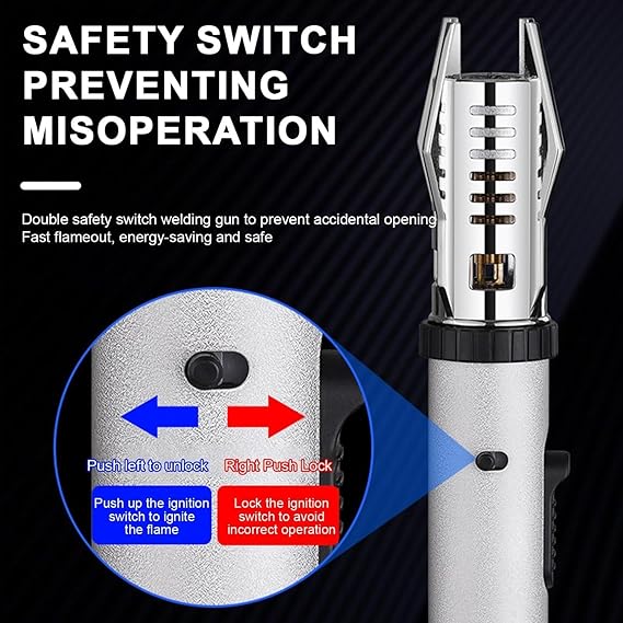 The safety lock switch ensures that the flame ignites only when it is intended, providing peace of mind during use. Press right to lock, press left to unlock, press up to open the switch and ignite the flame.