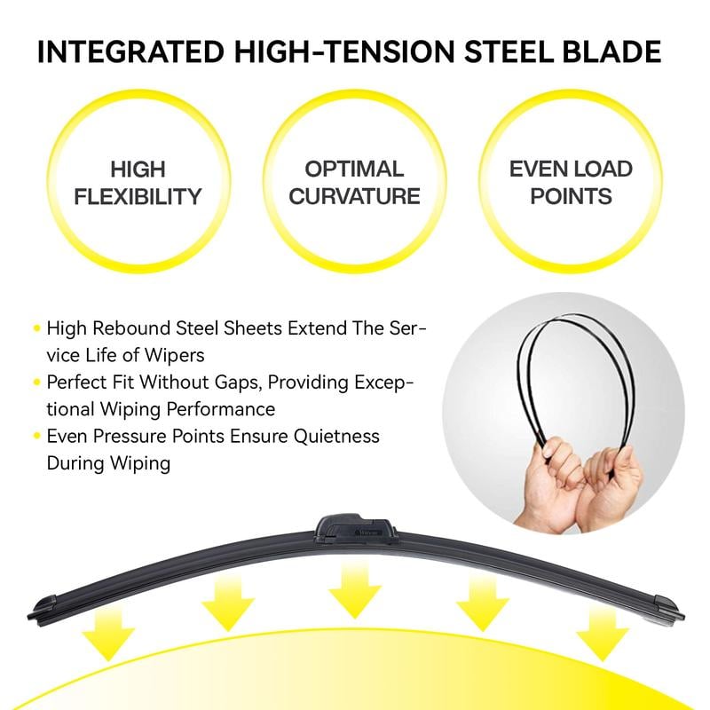 【0 Streak Wiping】:Dual high tenacity memory spring steel sheet, coupled with an asymmetrical wind spoiler, deliver uniform pressure distribution and windshield contact,without leaving any gaps while the wiper working.