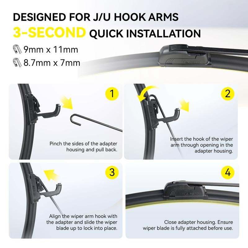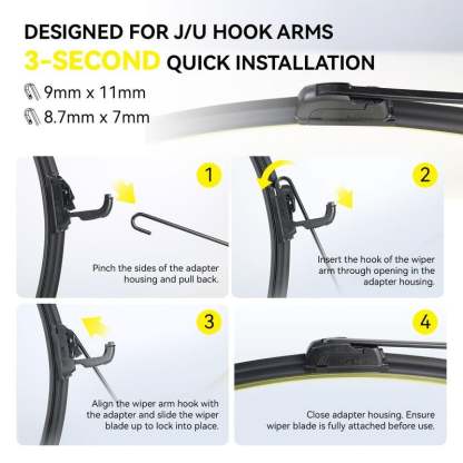 【Easy And Quick Installation】: Fit for U/J hook wiper arm; Easy installation and perfect fit, no need for awkward adapters;Install in seconds.