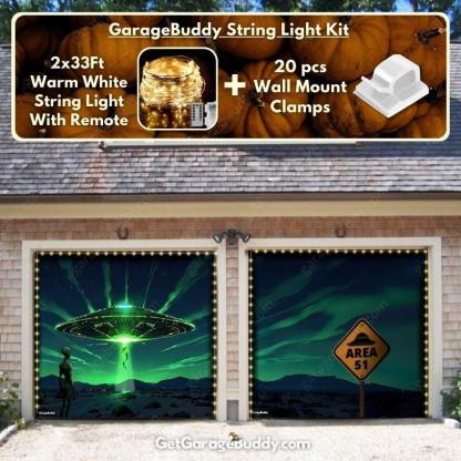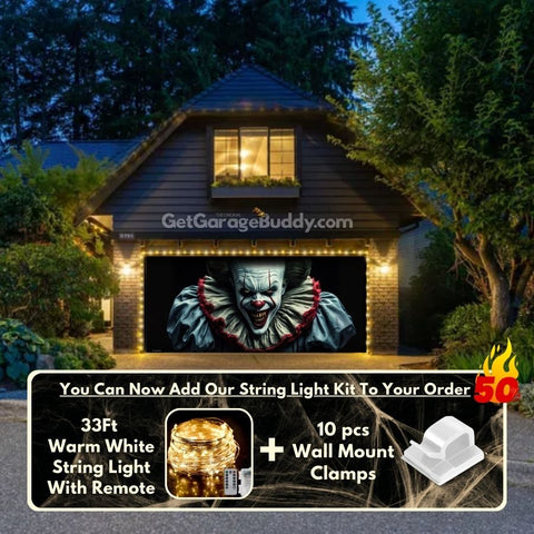 You now have the option to add the GarageBuddy string light kit to your order at 50% off and turn your garage into a true haunted showstopper. Pair your Halloween garage door cover with these glowing lights for the ultimate outdoor Halloween decoration. The kit includes 1x 33 ft warm white string light, a remote control, and 10x sticky wall mount clamps. The 2-door garage option comes with 2 string light kits. The lights work on three AA batteries (not included), so there's no need to worry about outlets.