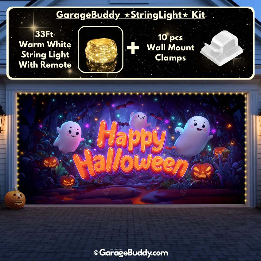 You now have the option to add the GarageBuddy string light kit to your order at 50% off and turn your garage into a true showstopper. The kit includes 1x 33 ft warm white string light, a remote control, and 10x sticky wall mount clamps. The 2-door garage option comes with 2 string light kits. The lights work on three AA batteries (not included), so you don't need to run around finding electrical outlets. Pair them with a cute Garage Door Cover for the ultimate haunted vibe.