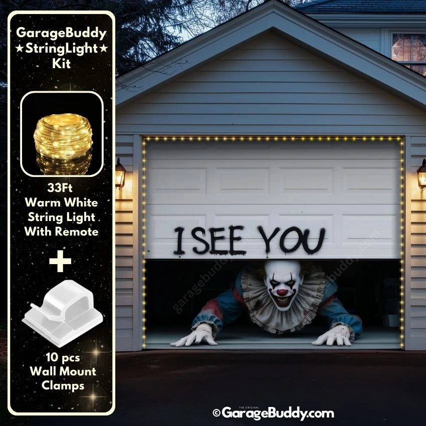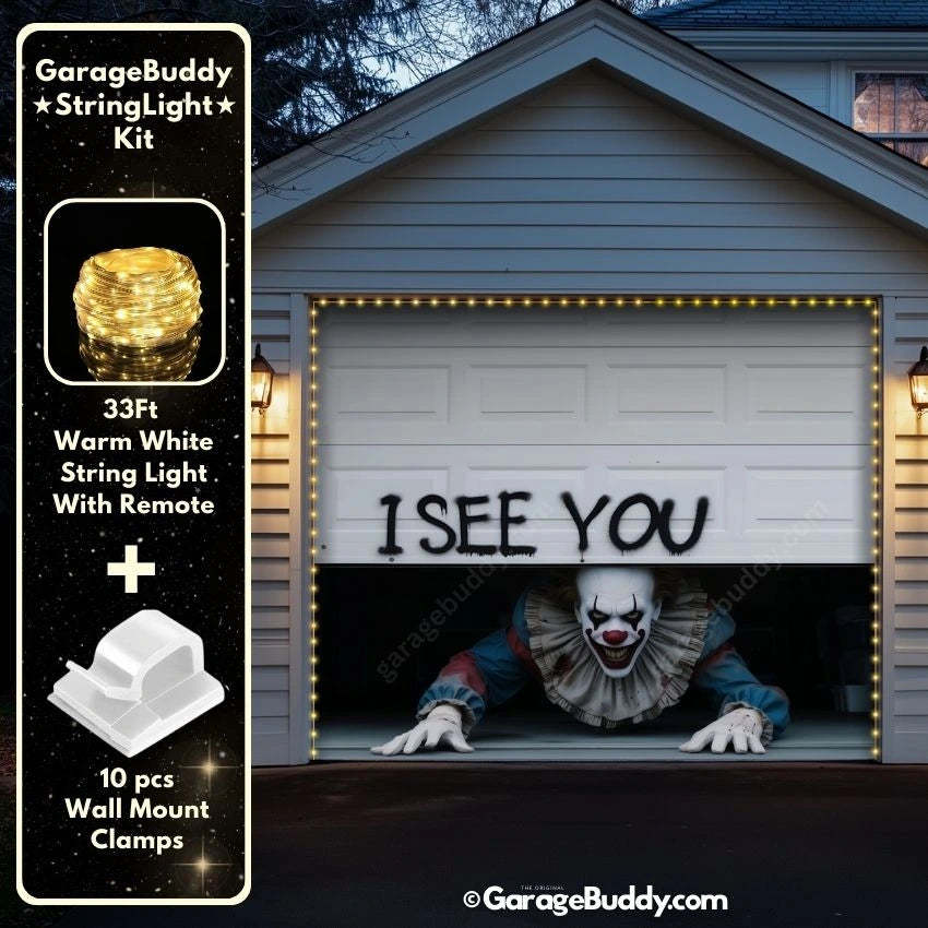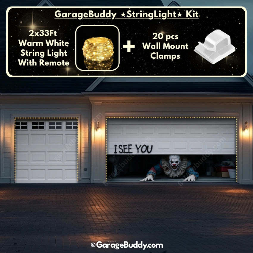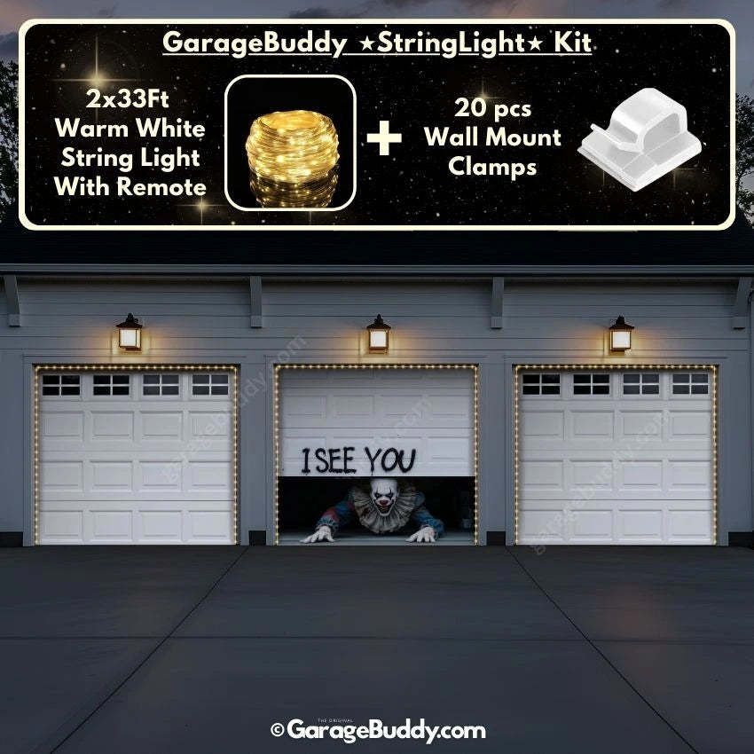 Want to take your Halloween outdoor decoration ideas to the next level? Add our GarageBuddy string light kit to your order at 50% off! The kit includes 1x 33 ft warm white string light, a remote control, and 10x sticky wall mount clamps. The 2-door garage option comes with 2 string light kits. The lights work on three AA batteries (not included), so you don't need to run around finding electrical outlets. Pair them with a Spooky Garage Door Cover for the ultimate haunted house effect.