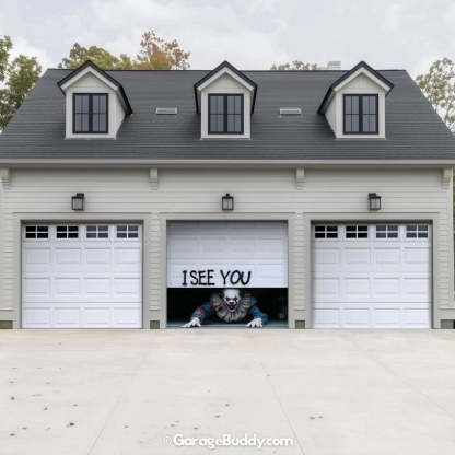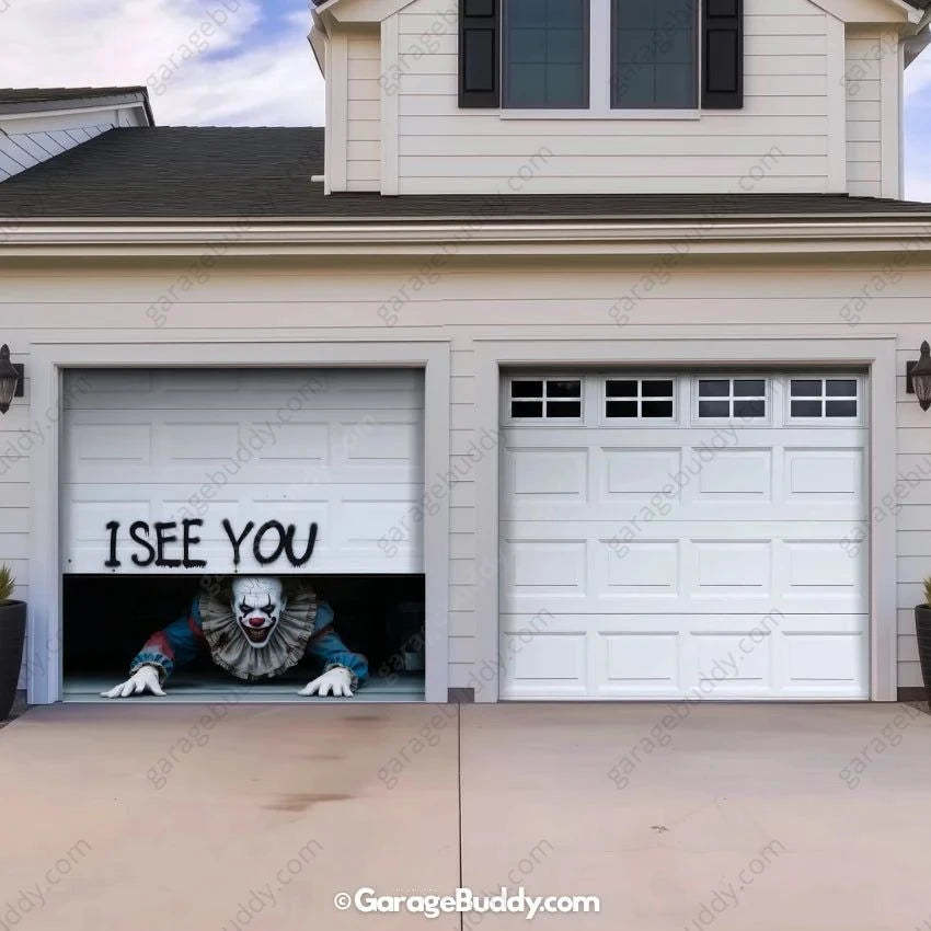 A life-sized nightmare creeping out from under your garage door, daring anyone to come closer. Caught mid-crawl, this Peeking Clown Halloween Garage Door Cover isn’t waiting for an invitation. One glance, and they’ll wish they’d never walked up your driveway.