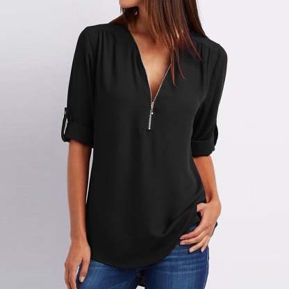 Plus Size Loose 3/4 Sleeve Zipper Blouse