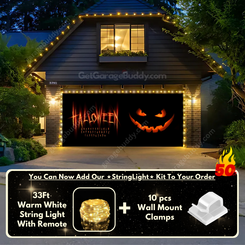 Now you can take your Halloween garage decoration ideas even further with our GarageBuddy string light kit—available at 50% off! Turn your garage into a true showstopper. The kit includes 1x 33 ft warm white string light, a remote control, and 10x sticky wall mount clamps. The 2-door garage option comes with 2 string light kits. The lights work on three AA batteries (not included), so there's no need to run around finding electrical outlets.
