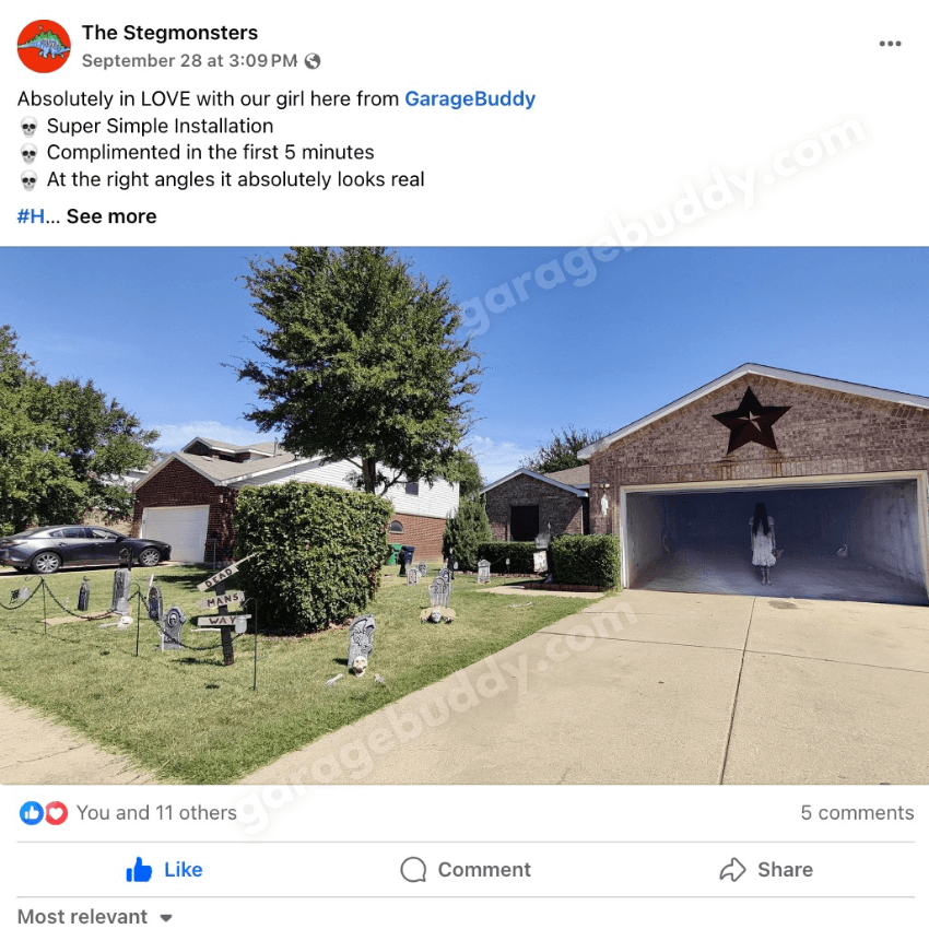 GarageBuddy's garage door covers have gone viral, inspiring over 1,000+ posts across social media in no time. From spooky Halloween garage door covers to creepy garage decorations, our customers are showing off their haunted homes and sharing their spookiest setups. (Images shown below belong to the original creators, not us.)