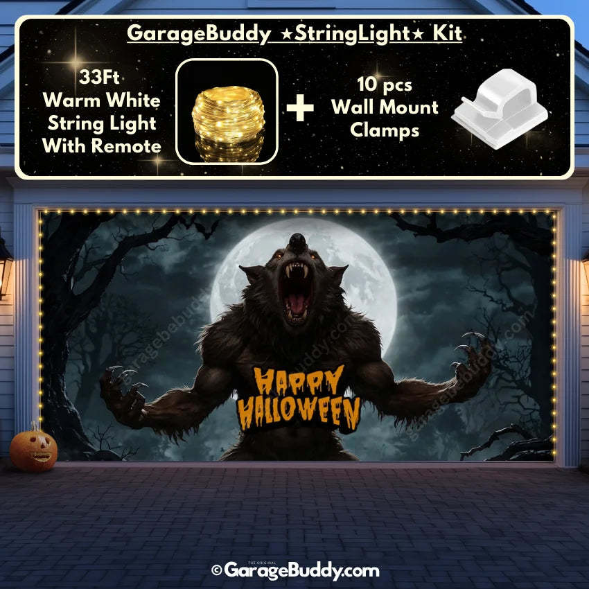 You can now add the GarageBuddy string light kit to your order at 50% off and turn your haunted display into a true showstopper. The kit includes 1x 33 ft warm white string light, a remote control, and 10x sticky wall mount clamps. The 2-door garage option comes with 2 string light kits. The lights work on three AA batteries (not included), so you don’t need to run around finding electrical outlets. Combine them with your creepy garage door cover for the ultimate haunted house vibe.